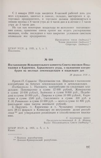 Постановление Исполнительного комитета Совета поселков Покатиловки и Карачевки, Харьковского уезда, о наложении контрибуции на местных землевладельцев и владельцев дач. 28 февраля 1918 г.