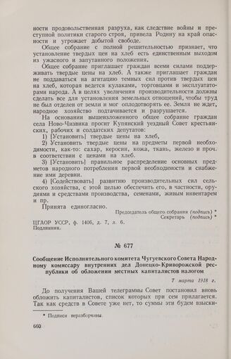 Сообщение Исполнительного комитета Чугуевского Совета Народному комиссару внутренних дел Донецко-Криворожской республики об обложении местных капиталистов налогом. 7 марта 1918 г.