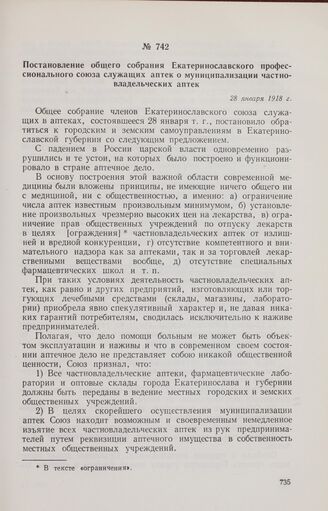 Постановление общего собрания Екатеринославского профессионального союза служащих аптек о муниципализации частновладельческих аптек. 28 января 1918 г.