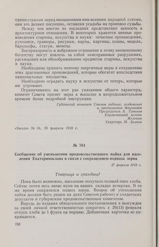 Сообщение об уменьшении продовольственного пайка для населения Екатеринослава в связи с сокращением подвоза зерна. 27 февраля 1918 г. // «Голос солдата», № 35, 27 февраля 1918 г.