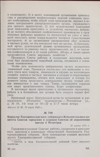 Циркуляр Екатеринославского губернского Исполнительного комитета Советов городским и уездным Советам об ограничении выезда в Петроград. 10 марта 1918 г.