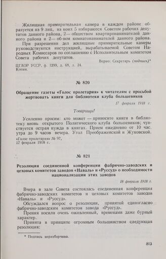 Обращение газеты «Голос пролетария» к читателям с просьбой жертвовать книги для библиотеки клуба большевиков. 17 февраля 1918 г.