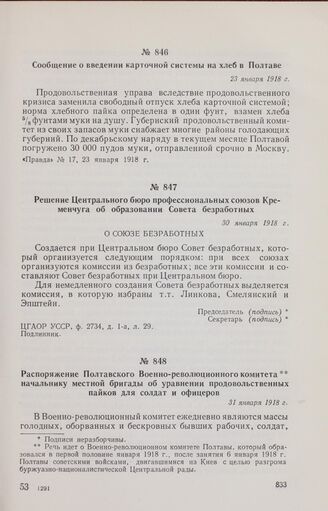 Решение Центрального бюро профессиональных союзов Кременчуга об образовании Совета безработных. 30 января 1918 г.