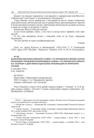 Донесение работника Военного совета 1-го Украинского фронта Салуна начальнику Управления контрразведки «Смерш» 1-го Украинского фронта Н.А. Осетрову о действиях подпольных организаций на территории Польши. 8 октября 1944 г. // ЦАМО РФ. Ф. 236. Оп. 2727. Д. 21. Л. 254–256. Копия. Машинопись.