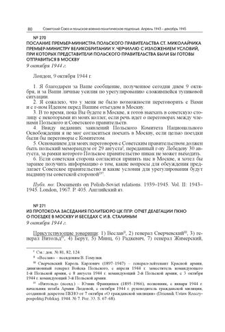 Из протокола заседания Политбюро ЦК ППР: отчет делегации ПКНО о поездке в Москву и беседах с И.В. Сталиным. 9 октября 1944 г. // Публ. по: Protokoły posiedzeń Biura Politycznego KC PPR 1944–1945. Warszawa, 1992. S. 16–19. Польский яз.