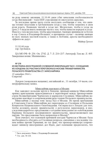Из Вестника иностранной служебной информации ТАСС. Сообщение из Лондона об участии в переговорах в Москве премьер-министра Польского правительства Ст. Миколайчика. 11 октября 1944 г. // ГА РФ. Ф. Р4459. Оп. 27. Д. 3182. Л. 118. Ротаторный экз.