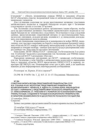 Советская запись беседы представителей правительства СССР И.В. Сталина и В.М. Молотова; представителей правительства Великобритании У. Черчилля, А. Идена и А. Кларка Керра; наблюдателя от США У. Гарримана с представителями Польского правительства Ст. Миколайчиком, Ст. Грабским и Т. Ромером об установлении новых границ Польши, создании в Польше коалиционного правительства и гарантиях независимости и целостности Польского государства. 13 октября 1944 г. // АВП РФ. Ф. 06. Оп. 6. Д. 19. П. 2. Л. 89–97. Подлинник. Машинопись. Опубл.: Ржешевский О.А. Сталин и Черчилль. Встречи. Беседы. Дискуссии. Документы, комментарии. 1941–1945. М., 2004. С. 440–448.