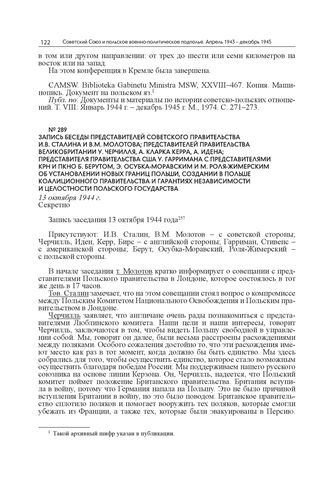 Запись беседы представителей Советского правительства И.В. Сталина и В.М. Молотова; представителей правительства Великобритании У. Черчилля, А. Кларка Керра, А. Идена; представителя правительства США У. Гарримана с представителями КРН и ПКНО Б. Берутом, Э. Осубка-Моравским и М. Роля-Жимерским об установлении новых границ Польши, создании в Польше коалиционного правительства и гарантиях независимости и целостности Польского государства. 13 октября 1944 г. // АВП РФ. Ф. 06. Оп. 6. Д. 19. П. 2. Л. 98–104. Заверенная копия. Машинопись. Опубл.: Ржешевский О.А. Сталин и Черчилль. Встречи. Беседы. Дискуссии. Документы, комментарии. 1941–1945. М., 2004. С. 448–454.