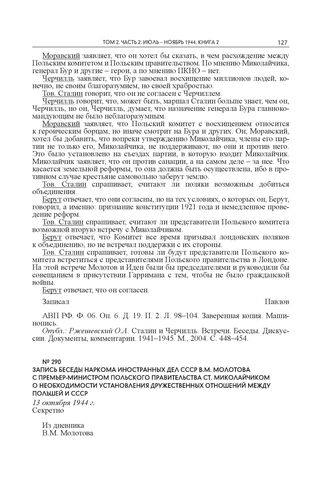 Запись беседы наркома иностранных дел СССР В.М. Молотова с премьер-министром Польского правительства Ст. Миколайчиком о необходимости установления дружественных отношений между Польшей и СССР. 13 октября 1944 г. // АВП РФ. Ф. 06. Оп. 6. Д. 545. П. 41. Л. 66–67. Подлинник. Машинопись. Опубл.: Советско-польские отношения в 1918–1945 гг. Сборник документов. В 4 т. Т. 4: 1939–1945. М., 2017. С. 632.