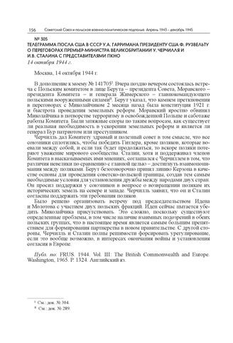 Телеграмма посла США в СССР У.А. Гарримана президенту США Ф. Рузвельту о переговорах премьер-министра Великобритании У. Черчилля и И.В. Сталина с представителями ПКНО. 14 октября 1944 г. // Публ. по: FRUS. 1944. Vol. III: The British Commonwealth and Europe. Washington, 1965. Р. 1324. Английский яз.