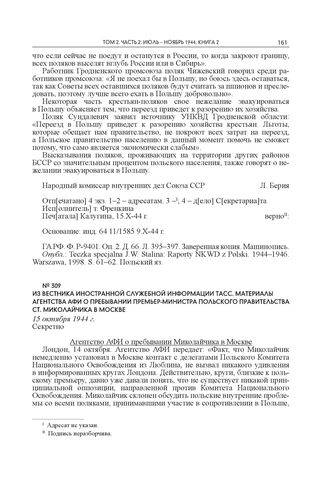 Из Вестника иностранной служебной информации ТАСС. Материалы агентства АФИ о пребывании премьер-министра Польского правительства Ст. Миколайчика в Москве. 15 октября 1944 г. // ГА РФ. Ф. Р-4459. Оп. 27. Д. 3190. Л. 176. Ротаторный экз.
