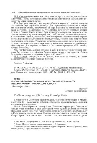 Британский проект соглашения между правительствами СССР и Великобритании по польскому вопросу. 16 октября 1944 г. // РГАСПИ. Ф. 558. Оп. 11. Д. 269. Л. 36–37. Заверенная копия. Правленный экз. Машинопись; Там же. Л. 38–40. Подлинник. Машинопись. Английский яз. Опубл.: Documents on Polish-Soviet relations. 1939–1945. Vol. II: 1943–1945. London, 1967. P. 428. Английский яз.; Armia Krajowa w dokumentach. 1939–1945. Т. V: Październik 1944 – lipiec 1945. Wrocław – Warszawa – Kraków, 1991. S. 72–73. Польский яз.