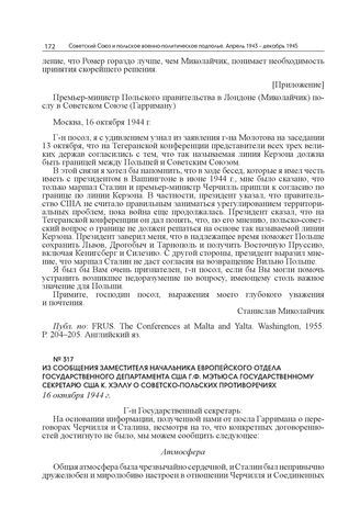 Из сообщения заместителя начальника Европейского отдела Государственного департамента США Г.Ф. Мэтьюса Государственному секретарю США К. Хэллу о советско-польских противоречиях. 16 октября 1944 г. // Публ. по: FRUS. 1944. Vol. IV: Europe. Washington, 1966. Р. 1016–1019. Английский яз. Частично опубл.: Путь к великой победе. СССР в войне глазами западных современников. Документы и материалы. М., 2015. С. 656–658.