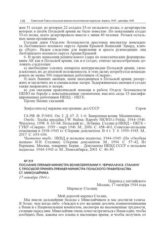 Послание премьер-министра Великобритании У. Черчилля И.В. Сталину с просьбой принять премьер-министра Польского правительства Ст. Миколайчика. 17 октября 1944 г. // РГАСПИ. Ф. 558. Оп. 11. Д. 269. Л. 49. Заверенная копия. Машинопись; Там же. Л. 50–51. Подлинник. Машинопись. Английский яз. Послание в отредактированном виде опубл.: Переписка Председателя Совета Министров СССР с президентами США и премьер-министрами Великобритании во время Великой Отечественной войны, 1941–1945 гг. В 2 т. Т. 1: Переписка с У. Черчиллем и К. Эттли (июль 1941 г. – ноябрь 1945 г.). М., 1989. С. 306.