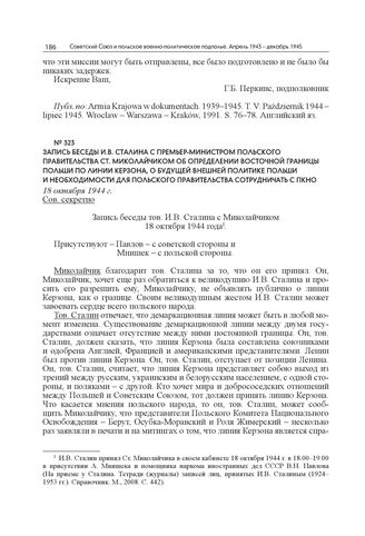 Запись беседы И.В. Сталина с премьер-министром Польского правительства Ст. Миколайчиком об определении восточной границы Польши по линии Керзона, о будущей внешней политике Польши и необходимости для Польского правительства сотрудничать с ПКНО. 18 октября 1944 г. // АВП РФ. Ф. 06. Оп. 6. Д. 555. П. 42. Л. 16–20. Подлинник. Машинопись. РГАСПИ. Ф. 558. Оп. 11. Д. 358. Л. 25–30. Подлинник. Машинопись.