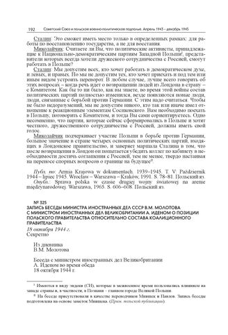 Запись беседы министра иностранных дел СССР В.М. Молотова с министром иностранных дел Великобритании А. Иденом о позиции Польского правительства относительно состава коалиционного правительства. 18 октября 1944 г. // АВП РФ. Ф. 06. Оп. 6. Д. 19. П. 2. Л. 128–129. Подлинник. Машинопись. АВП РФ. Ф. 06. Оп. 6. Д. 228. П. 22. Л. 83–84. Заверенная копия. Машинопись.