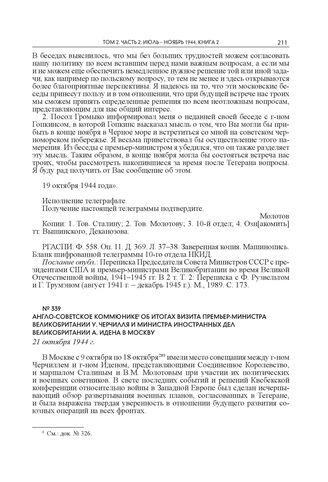 Англо-советское коммюнике об итогах визита премьер-министра Великобритании У. Черчилля и министра иностранных дел Великобритании А. Идена в Москву. 21 октября 1944 г. // Публ. по: Известия. 1944. 21 октября. Опубл.: Правда. 1944. 21 октября; Ржешевский О.А. Сталин и Черчилль. Встречи. Беседы. Дискуссии. Документы, комментарии. 1941–1945. М., 2004. С. 482–483.