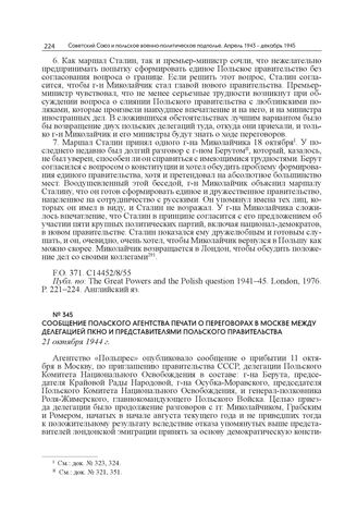 Сообщение Польского агентства печати о переговорах в Москве между делегацией ПКНО и представителями Польского правительства. 21 октября 1944 г. // Публ. по: Известия. 1944. 21 октября. Опубл.: Правда. 1944. 21 октября; Внешняя политика Советского Союза в период Отечественной войны. Документы и материалы. В 3 т. Т. 2: 1 января – 31 декабря 1944 г. М., 1946. С. 272–273. Частично опубл.: Документы и материалы по истории советско-польских отношений. Т. VIII: Январь 1944 г. – декабрь 1945 г. М., 1974. С. 280–281. Польский текст коммюнике опубл.: Rzeczpospolita. 1944. 21 pazdziernik; Sprawa polska w czasie drugiej wojny światowej na arenie międzynarodowej. Zbiór dokumentów. Warszawa, 1965. S. 609. Польский яз.