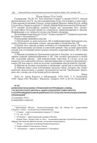 Донесение начальника Управления контрразведки «Смерш» 1-го Белорусского фронта А. Вадиса Военному совету фронта о контрразведывательной деятельности польских нелегальных военных организаций. 22 октября 1944 г. // ЦАМО РФ. Ф. 233. Оп. 2380. Д. 19. Л. 174–175. Подлинник. Машинопись.