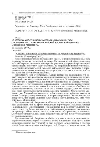 Из Вестника иностранной служебной информации ТАСС. Сообщение ТАСС «Отклики английской воскресной печати на Московские переговоры». 23 октября 1944 г.