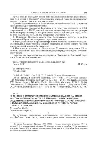 Из донесения заместителя наркома внутренних дел СССР И.А. Серова наркому внутренних дел СССР Л.П. Берии о результатах агентурно-следственных и войсковых мероприятий по борьбе с Армией Крайовой и другими подпольными организациями на территории Польши с 20 по 25 октября 1944 г. 26 октября 1944 г. // Публ. по: НКВД и польское подполье, 1944–1945: (По «Особым папкам» И.В. Сталина). Сборник документов. М., 1994. С. 52–55. Опубл.: Teczka specjalna J.W. Stalina: Raporty NKWD z Polski. 1944–1946. Warszawa, 1998. S. 81–83. Польский яз.; Из Варшавы. Москва, товарищу Берия… Документы НКВД СССР о польском подполье. 1944–1945 гг. М.; Новосибирск, 2001. С. 60–65.
