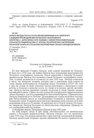 Запись беседы посла СССР в Великобритании И.М. Майского с бывшим руководителем Польского телеграфного агентства С. Литауэром о его разрыве с министром информации Польского правительства Ст. Котом, политических настроениях польской элиты и о Польских вооруженных силах в Западной Европе. 27 октября 1944 г. // АВП РФ. Ф. 06. Оп. 6. Д. 38. П. 4. Л. 88–93. Подлинник. Машинопись. Опубл.: Советско-польские отношения в 1918–1945 гг. Сборник документов. В 4 т. Т. 4: 1939–1945. М., 2017. С. 638–641.