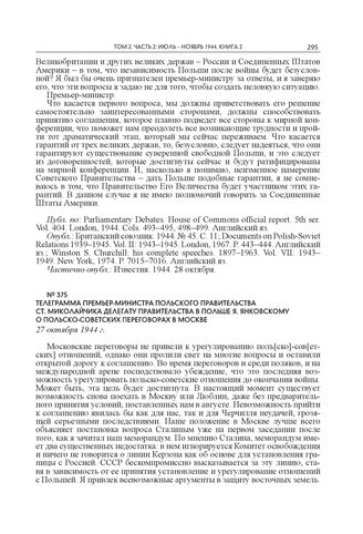 Телеграмма премьер-министра Польского правительства Ст. Миколайчика делегату правительства в Польше Я. Янковскому о польско-советских переговорах в Москве. 27 октября 1944 г. // CA KC PZPR. 202/1. T. 4. K. 310–313. Копия. Машинопись. Польский яз. Публ. по: Документы и материалы по истории советско-польских отношений. Т. VIII: Январь 1944 г. – декабрь 1945 г. М., 1974. С. 282–285.