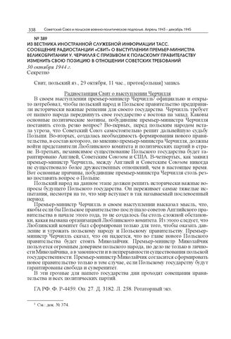 Из Вестника иностранной служебной информации ТАСС. Сообщение радиостанции «Свит» о выступлении премьер-министра Великобритании У. Черчилля с призывом к Польскому правительству изменить свою позицию в отношении советских требований. 30 октября 1944 г. // ГА РФ. Ф. Р-4459. Оп. 27. Д. 3182. Л. 258. Ротаторный экз.