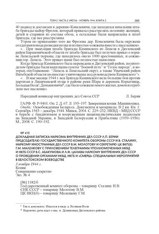 Докладная записка наркома внутренних дел СССР Л.П. Берии председателю Государственного комитета обороны СССР И.В. Сталину, наркому иностранных дел СССР В.М. Молотову и секретарю ЦК ВКП(б) Г.М. Маленкову с приложением телеграммы уполномоченных НКВД и НКГБ СССР В.С. Абакумова и Л.Ф. Цанавы наркому внутренних дел СССР о проведении органами НКВД, НКГБ и «Смерш» специальных мероприятий в Белостокском воеводстве. 3 ноября 1944 г. // ГА РФ. Ф. Р-9401. Оп. 2. Д. 67. Л. 198. Заверенная копия. Машинопись. Приложение публ. по: НКВД и польское подполье, 1944–1945: (По «Особым папкам» И.В. Сталина). Сборник документов. М., 1994. С. 59–65. Приложение опубл.:Teczka specjalna J.W. Stalina: Raporty NKWD z Polski. 1944–1946. Warszawa, 1998. S. 90–94. Польский яз.; Из Варшавы. Москва, товарищу Берия… Документы НКВД СССР о польском подполье. 1944–1945 гг. М.; Новосибирск, 2001. С. 67–71.