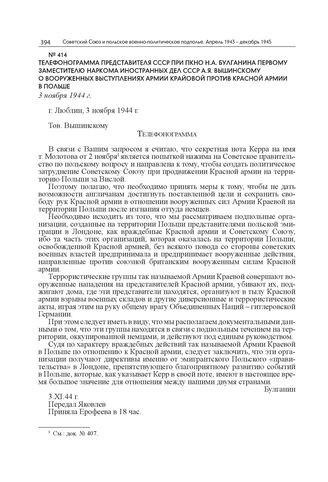 Телефонограмма представителя СССР при ПКНО Н.А. Булганина первому заместителю наркома иностранных дел СССР А.Я. Вышинскому о вооруженных выступлениях Армии Крайовой против Красной армии в Польше. 3 ноября 1944 г. // АВП РФ. Ф. 07. Оп. 5. Д. 119. П. 46. Л. 8–9. Заверенная копия. Машинопись. Опубл.: Восточная Европа в документах российских архивов. 1944–1953 гг. В 2 т. Т. 1: 1944–1948 гг. М.; Новосибирск, 1997. С. 85–86.