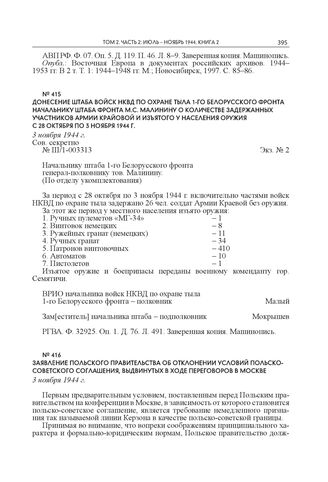 Донесение штаба войск НКВД по охране тыла 1-го Белорусского фронта начальнику штаба фронта М.С. Малинину о количестве задержанных участников Армии Крайовой и изъятого у населения оружия с 28 октября по 3 ноября 1944 г. 3 ноября 1944 г. // РГВА. Ф. 32925. Оп. 1. Д. 76. Л. 491. Заверенная копия. Машинопись.