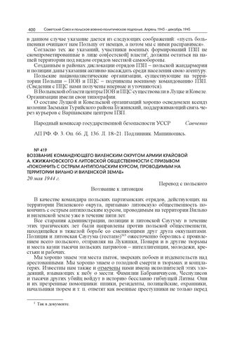 Воззвание командующего Виленским округом Армии Крайовой А. Кжижановского к литовской общественности с призывом «покончить с острым антипольским курсом, проводимым на территории Вильно и виленской земле». 20 мая 1944 г.