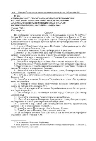 Справка военного прокурора Главной военной прокуратуры Красной армии Китаева о случаях убийств участниками Армии Крайовой бойцов и офицеров Красной армии на территории Польши за сентябрь – ноябрь 1944 г. 7 июня 1945 г. // ЦА ФСБ РФ. Ф. Р39269. Т. 25. Л. 273–275. Подлинник. Машинопись.