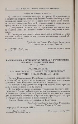 Главная Октябрьская революция и установление советской власти в республиках... Коммунистическая партия Советского Союза в борьбе за победу социали... Коммунистическая партия Советского Союза в борьбе за победу Великой... Документы Постановление о производстве выборов в Учредительное собрание в наз...