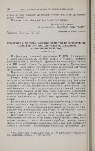 Резолюция о текущем моменте, принятая на конференции Бакинской организации РСДРП (большевиков и интернационалистов). 19 июля 1917 г.
