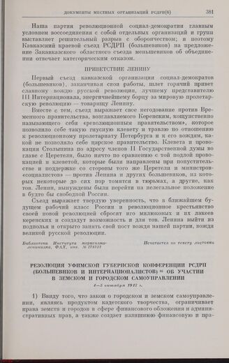 Резолюция Уфимской губернской конференции РСДРП (большевиков и интернационалистов) об участии в земском и городском самоуправлении. 4-5 октября 1917 г.