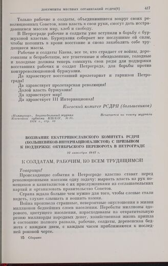 Главная Октябрьская революция и установление советской власти в республиках... Коммунистическая партия Советского Союза в борьбе за победу социали... Коммунистическая партия Советского Союза в борьбе за победу Великой... Документы Воззвание Екатеринославского комитета РСДРП (большевиков-интернацио...