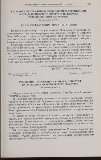 Воззвание Центрального бюро военных организаций РСДРП(б) Кавказского фронта о поддержке революционного Петрограда. 29 октября 1917 г. // «Брдзола» («Борьба») № 22, 29 октября 1917 г.