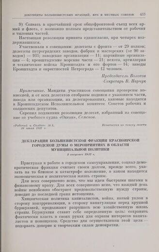 Декларация большевистской фракции Красноярской городской думы о мероприятиях в области муниципальной политики. 1 августа 1917 г.
