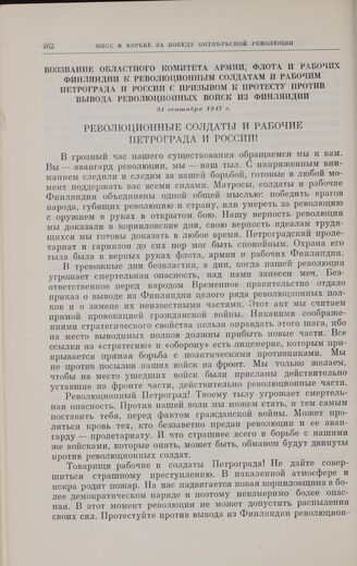 Воззвание областного комитета армии, флота и рабочих Финляндии к революционным солдатам и рабочим Петрограда и России с призывом к протесту против вывода революционных войск из Финляндии. 24 сентября 1917 г.