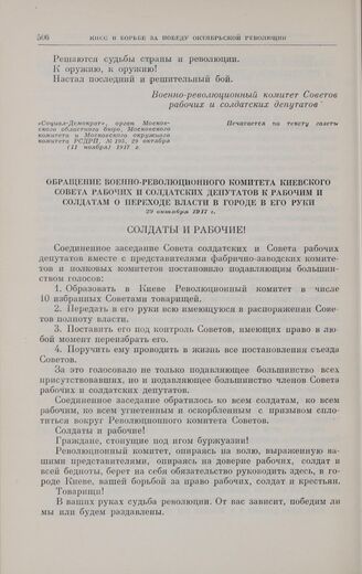 Обращение Военно-революционного комитета Киевского Совета Рабочих и солдатских депутатов к рабочим и солдатам о переходе власти в городе в его руки. 29 октября 1917 г.