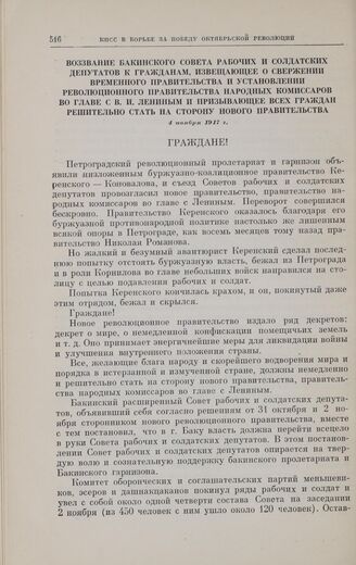 Воззвание Бакинского Совета рабочих и солдатских депутатов к гражданам, извещающее о свержении Временного правительства и установлении революционного правительства народных комиссаров во главе с В.И. Лениным и призывающее всех граждан решительно с...