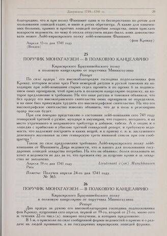 Барон Мюнхгаузен. Документы 1739-1741 гг. Поручик Мюнхгаузен — в полковую канцелярию. Репорт. Апреля 19-го дня 1741 году. Рига