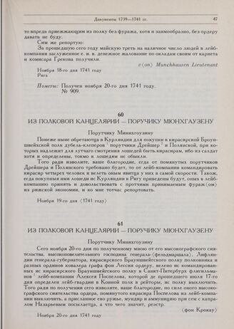 Барон Мюнхгаузен. Документы 1739-1741 гг. Из полковой канцелярии — поручику Мюнхгаузену. Ноября 19-го дня 1741 году // РГВИА. Ф. 393. Оп. 13. Д. 253. Л. 309. Копия с отпуска.