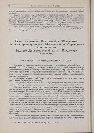 Речь, говоренная 20-го сентября 1816-го года Великим Провинциальным Мастером А.А. Жеребцовым при закрытии Великой Директоральной ... Владимира к порядку