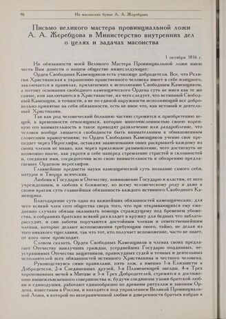 Письмо великого мастера провинциальной ложи А.А. Жеребцова в Министерство внутренних дел о целях и задачах масонства. 1 октября 1816 г. // ГАРФ. Ф. 1165. Оп. 3. Ед. хр. 54. Л. 42—47.