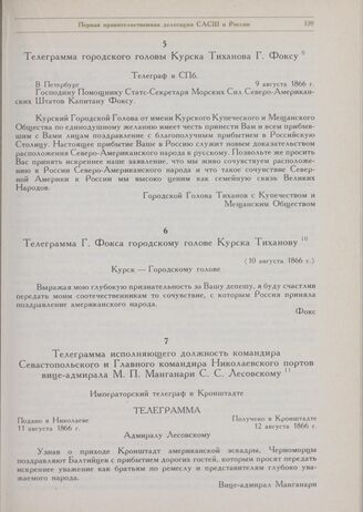 Первая правительственная делегация САСШ в России. Телеграмма городского головы Курска Тиханова Г. Фоксу. 9 августа 1866 г. // РГА ВМФ. Ф. 930. Оп. 49. Д. 308. Л. 157, 158. Телеграфный бланк.