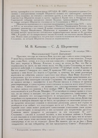 Письмо М.В. Катковой к С.Д. Шереметеву. Знаменское, 26 сентября 1906 г.