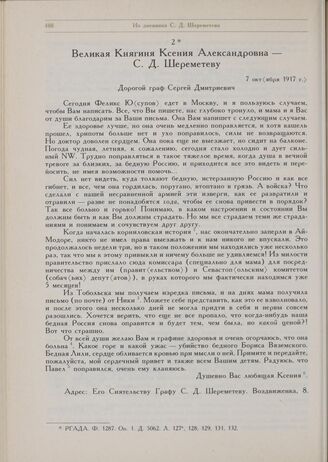 Из дневника графа С.Д. Шереметева. Великая Княгиня Ксения Александровна С.Д. Шереметеву. 7 октября 1917 г. // РГАДА. Ф. 1287. Оп. 1. Д . 5062. Л. 127а, 128, 129, 131, 132.