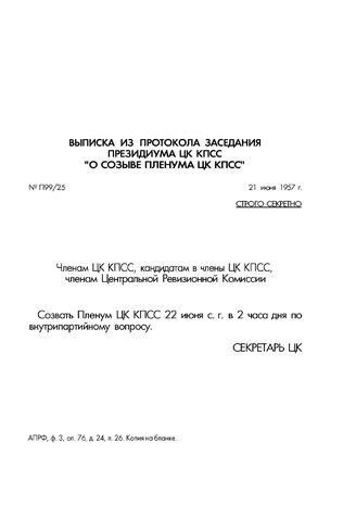 Выписка из протокола заседания Президиума ЦК КПСС «О созыве Пленума ЦК КПСС». 21 июня 1957 г. // АПРФ, ф. 3, оп. 76, д. 24, л. 26. Копия на бланке.